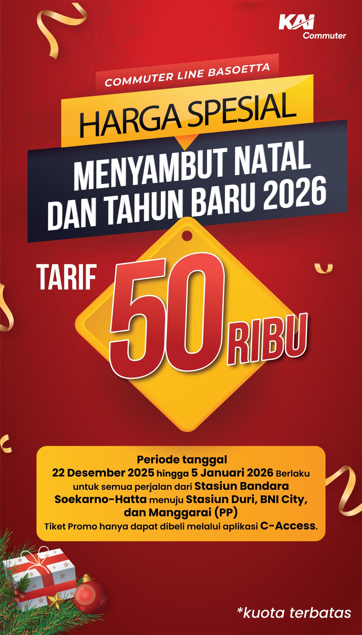 Jakarta (Bindo.id) – KAI Commuter hadirkan promo tiket harga spesial dalam meyambut Natal dan Tahun Baru 2026. Promo harga spesial ini diberikan khusus kepada para pengguna Commuter Line Basoetta dengan tarif Rp.50 ribu bagi pengguna yang naik dari Stasiun Manggarai/BNI City/Duri menuju Stasiun Bandara Soetta atau sebaliknya.